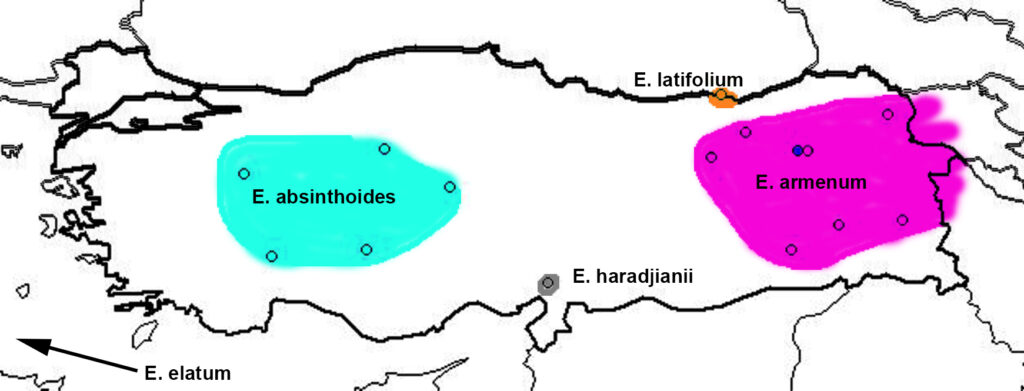 The populations of these species are widely separated. The centre of the E. elatum population is some 1700km from the E. armenum population – about the distance from London to southern Spain.