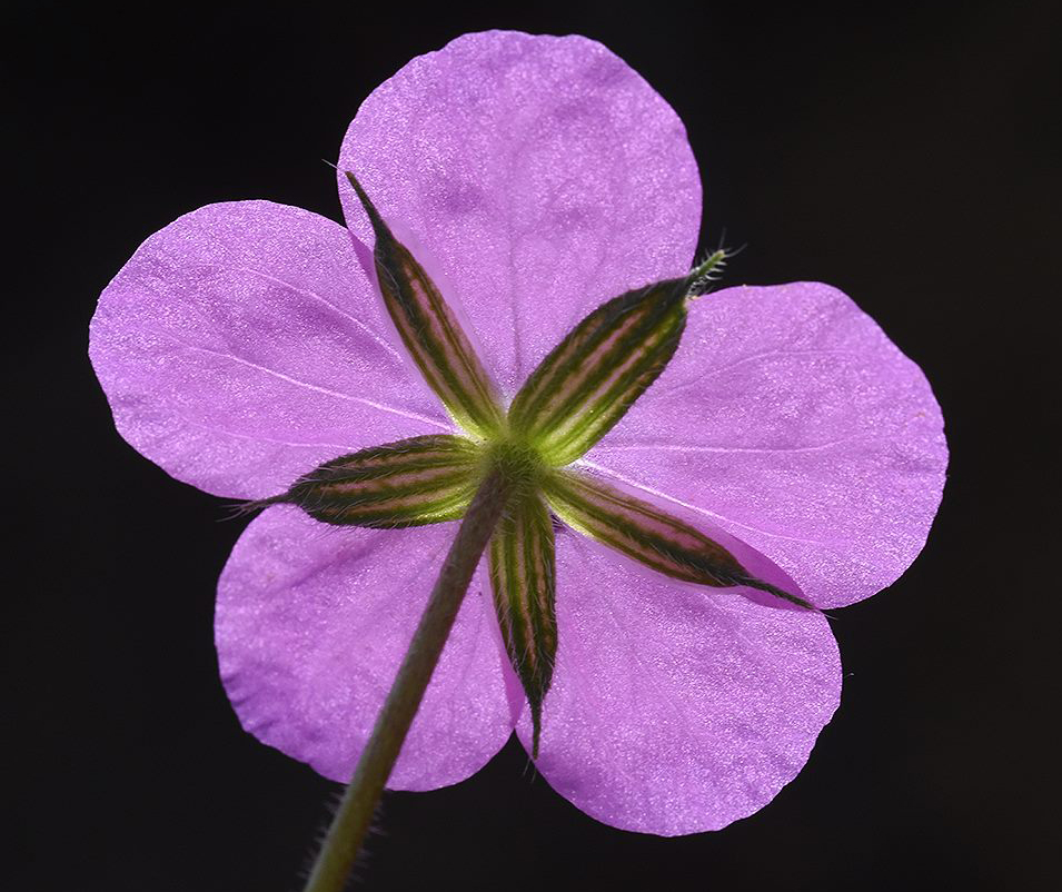 Inflorescence: Peduncles much longer than leaves; umbels 3-7 flowered; bracts membranous, broadly ovate, acutish; pedicels much longer than the flowers; sepals 6-8mm, papillose to patulose-hirsute, ending in mucro 1mm tipped with a bristle; petals c. 2x sepals, lilac-pink; filaments pink, glabrous; anthers dark purple; pollen orange; stigma pink; flowers March-April.